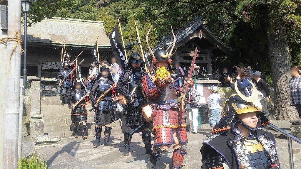しずかな神社の境内に立ち並ぶ勇ましいサムライたちがズラリと並んでいる様子です。