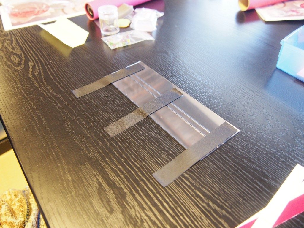 まず、大きなガラス2枚と、小さなガラス1枚をテープでくっつけます。